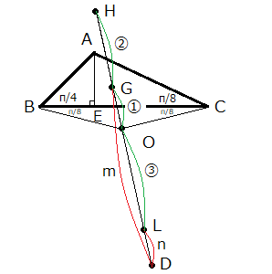 また,\(□DBOC:□OBGC=3x+n:x\)で\(4x=m-n\)(\(①