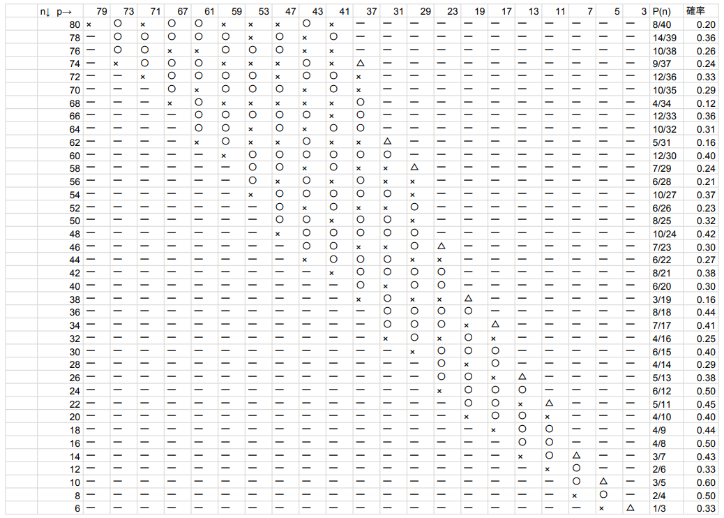 方針に基づいて,表形式で\(q=n-p\)の素数判定を行うと次のようになる.