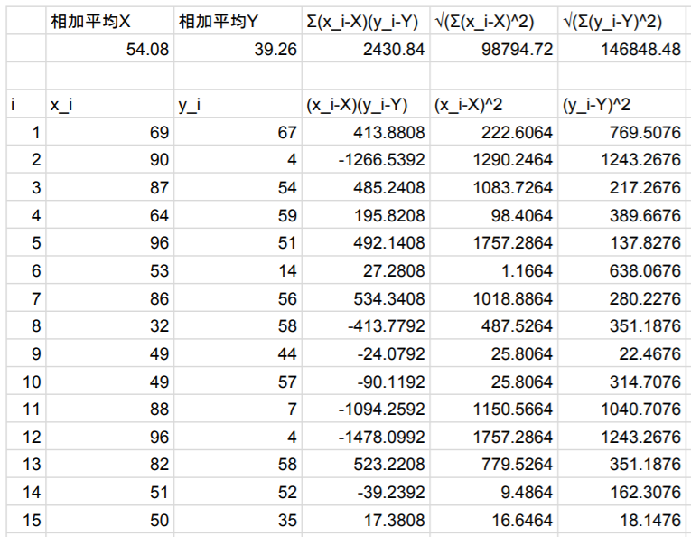 このデータを計算すると次のようになる(\(i=16\)以降は省略)
